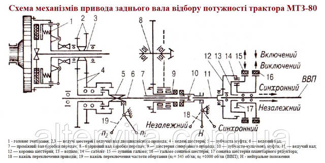 Трактори МТЗ-80 і МТЗ-82 обладнані комбінованою системою заднього вала відбору потужності планетарного типу, яка забезпечує роботу вала як з незалежним, так і з синхронним приводом.